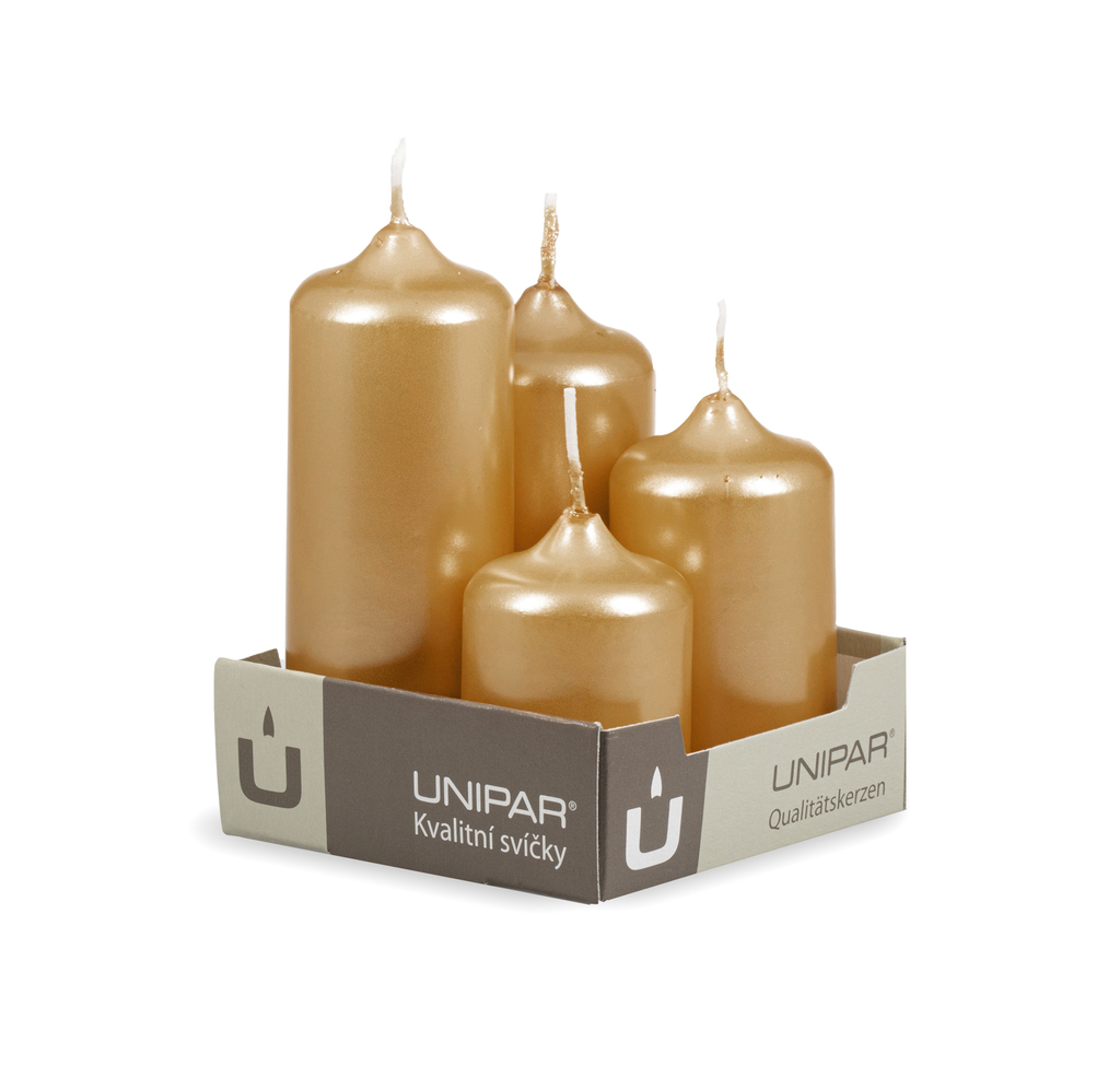 Adventní svíčky ve zlaté metalické barvě v odstupňovaných velikostech (40x60, 40x75, 40x90, 40x105 mm).