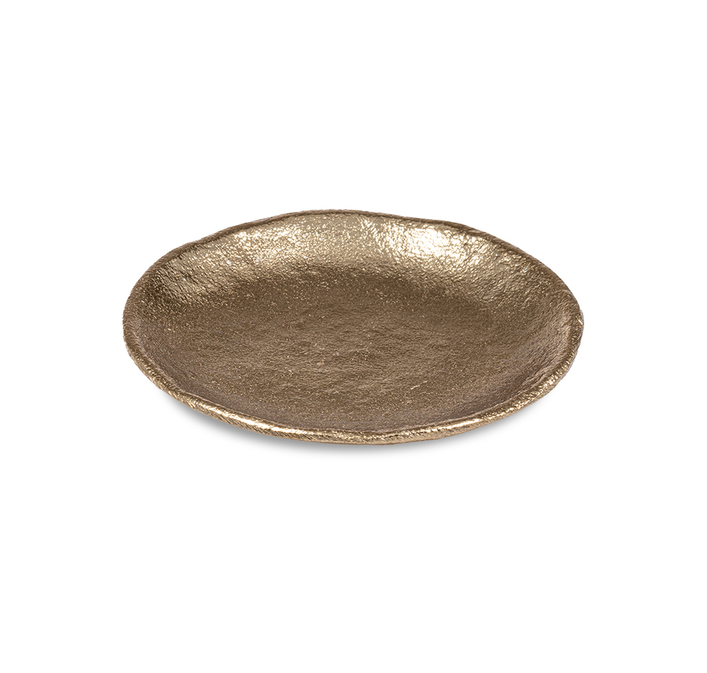 Dodáte svým svíčkám a dekoracím elegantní základ, který jemně zvýrazní jejich krásu. Tento menší kovový tácek v teplém zlatém odstínu má výrazný strukturální povrch se zrnitým efektem, který zachycuje světlo a vytváří zajímavou hru odlesků.