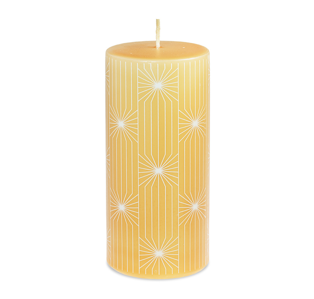 Díky své syté barvě a preciznímu tisku působí tato svíčka sofistikovaně a moderně. Vzor elegantních linií evokuje sluneční světlo pronikající skrz ranní opar, přinášející klid a rovnováhu.