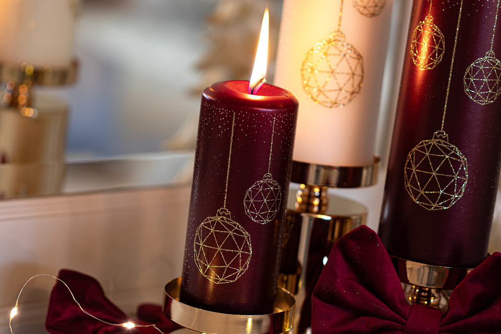 A modern Christmas candle collection in deep metallic shades, complemented by an elegant gold print. The geometric ornaments feel clean and contemporary, while the delicate dots create the impression of gentle falling sparks. Six colors and three sizes allow for beautifully balanced combinations, with chalk white as a timeless unifying element.