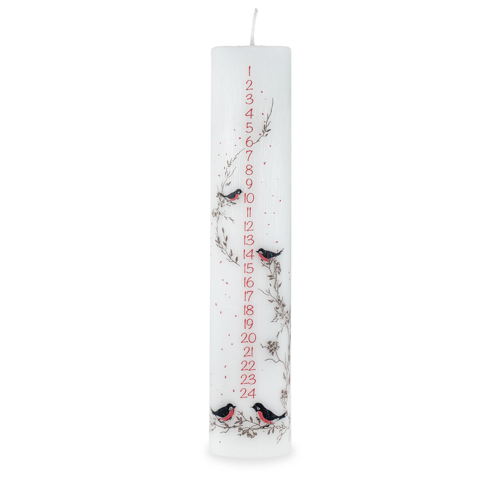 Na bílé svíčce s originálním dekorem barevných ptáčků a škrábaným povrchem o velikosti 5x25 cm jsou natištěny kalendářní dny 1-24 a jak svíčka hoří, čísla postupují až ke Štědrému dni.