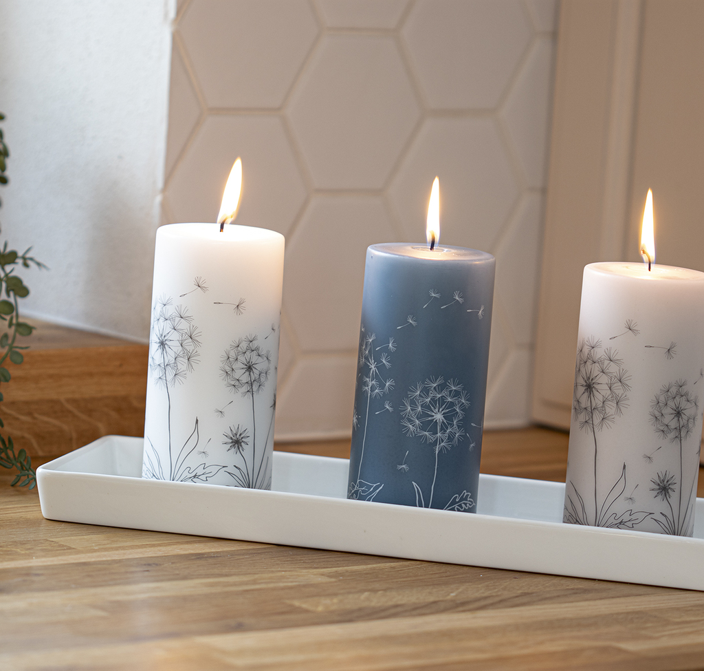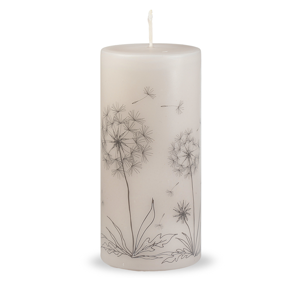 Béžová svíčka s jemným vzorem odkvétajících pampelišek v antracitové barvě.Jedním z oblíbených vzorů inspirovaných krásou přírody je právě pampeliškové chmýří.