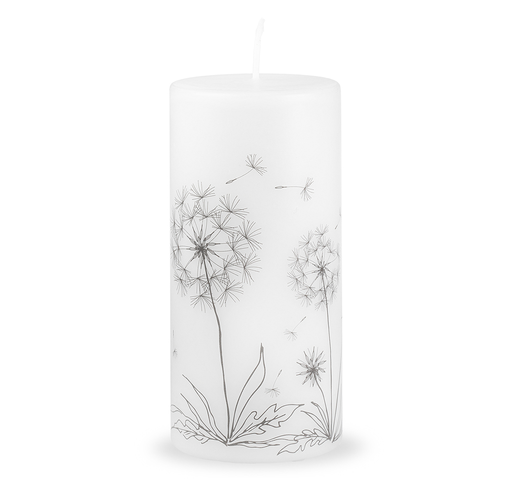 Bílá svíčka s jemným vzorem odkvétajících pampelišek v antracitové barvě.