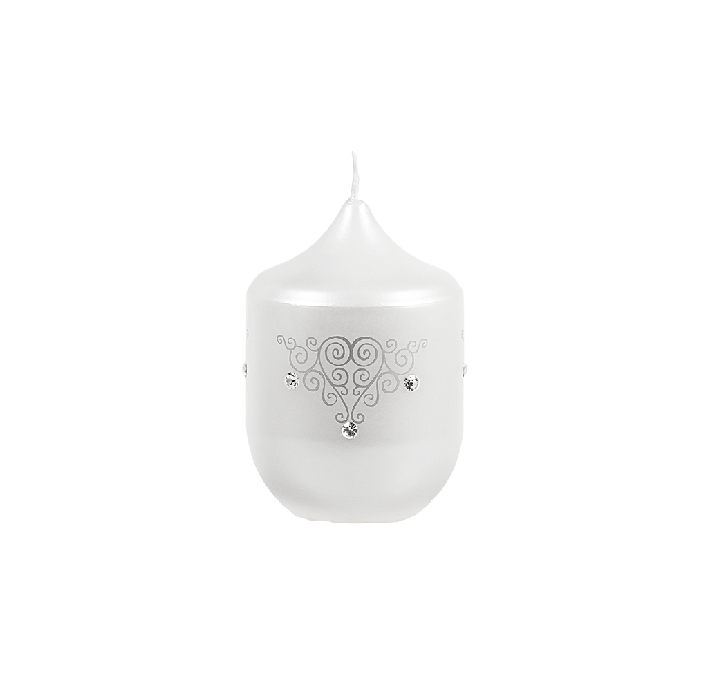 Perleťově bílá svíčka s jemným a elegantním stříbrným tiskem. Krásu této kolekce dotváří ruční zdobení kamínky PRECIOSA.