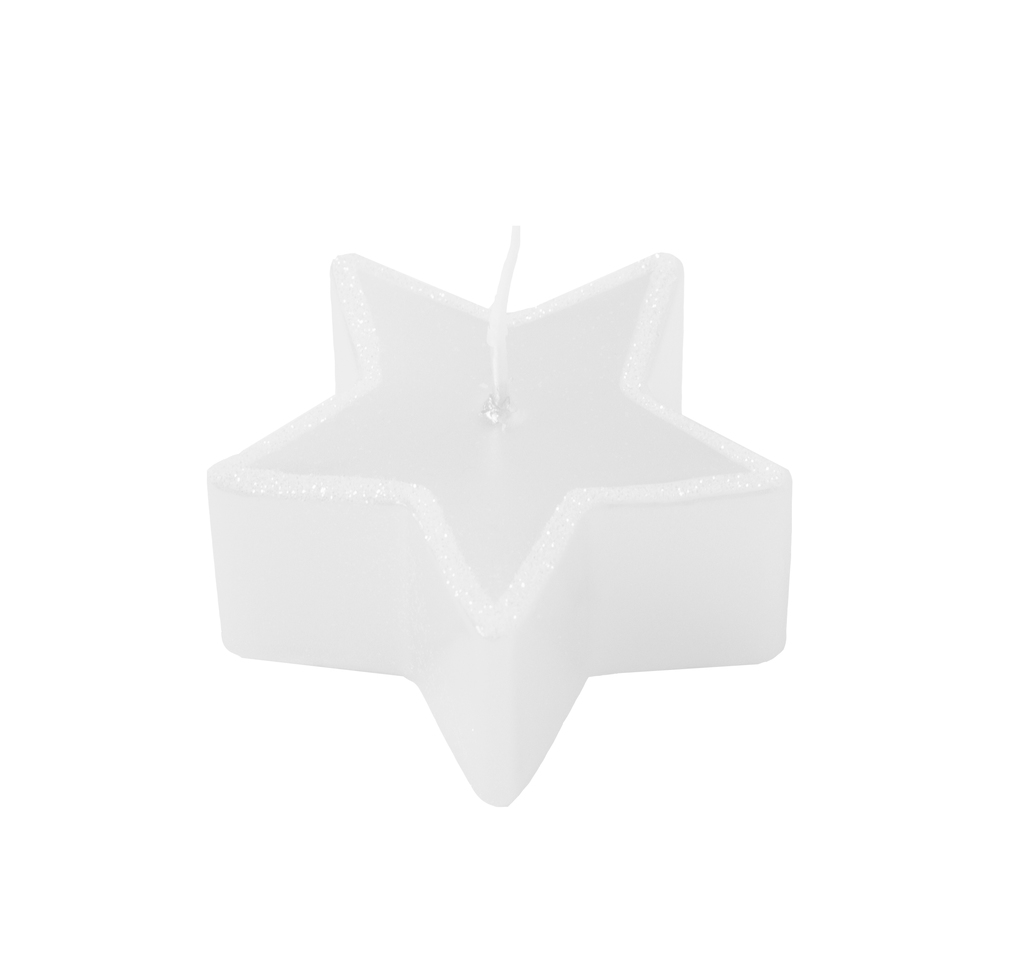 Vánoční svíčka ve tvaru hvězdy v bílé metalické barvě, dozdobená třpytivým posypem, která může plavat na vodní hladině.