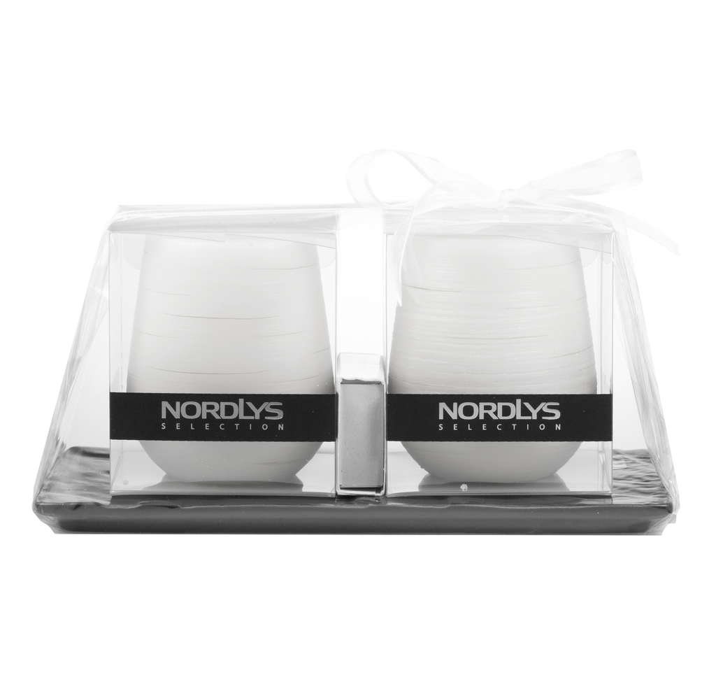 Součástí dárkového balíčku jsou dvě svíčky ze skandinávské kolekce Steep Line v bílé barvě (Cone 70-80 mm), keramická podložka černé barvy 21x10 cm, zápalky.
