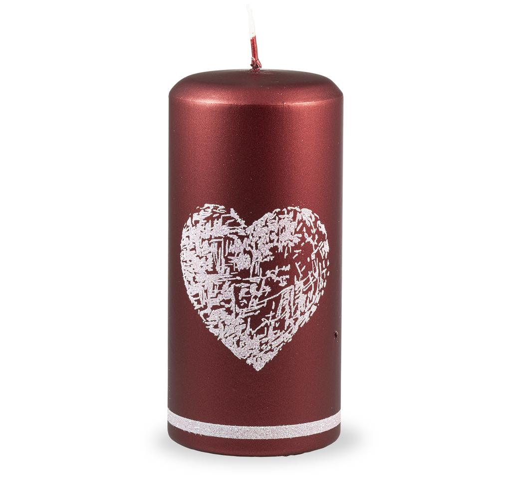 Originální svíčka v červené metalízové barvě, která se s oblibou aranžuje nejen na svatební tabule. Červená barva v kombinaci s velkým třpytivým srdcem vytváři pocit luxusu, krásy a neobyčejnosti.