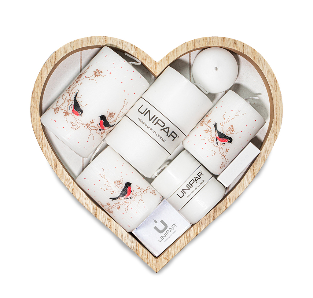 Dvě jednobarevné bílé svíčky představují jednoduchost a eleganci. Jejich čistota zvýrazní krásu jakéhokoli interiéru a poskytne vám nekonečné možnosti, jak je kombinovat s dalšími dekoracemi. V jednobarevném provedení je také jedna malá plovoucí svíčka, která je také součástí balíčku. Tři ze šesti svíček v tomto balíčku jsou zdobeny malebným motivem větviček a malými ptáčky. Každá z těchto svíček je výsledkem pečlivé práce a uměleckého nadání. Ručně škrábaný povrch dodává svíčkám unikátní vzhled.