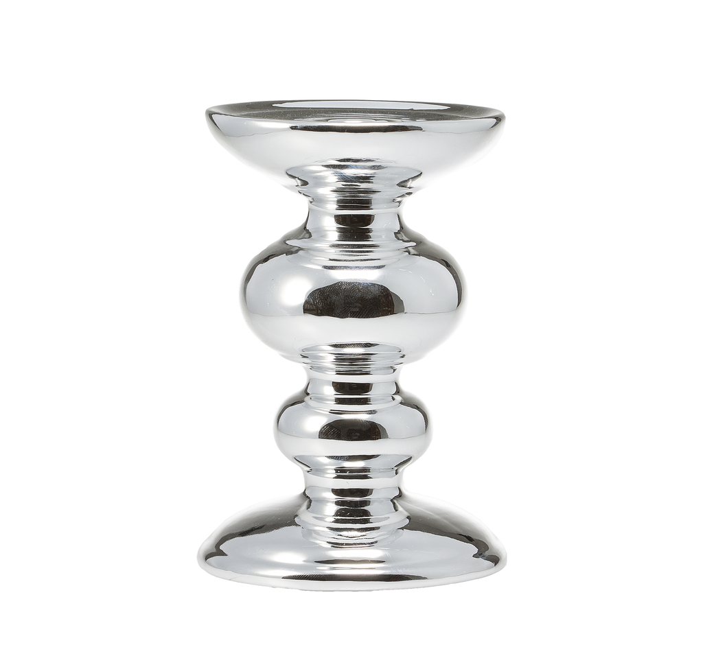 Keramický svícen v lesklé stříbrné barvě vhodný pro svíčky do průměru 8 cm.