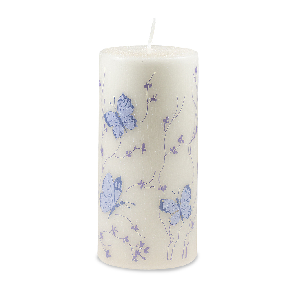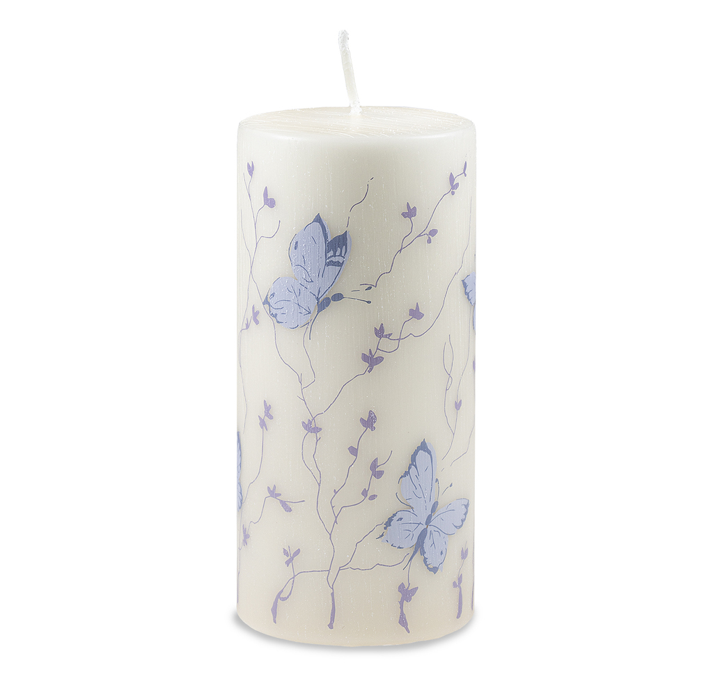 Svíčka v krémové barvě v přírodním designu v jemných barvách se vzorem motýlků.