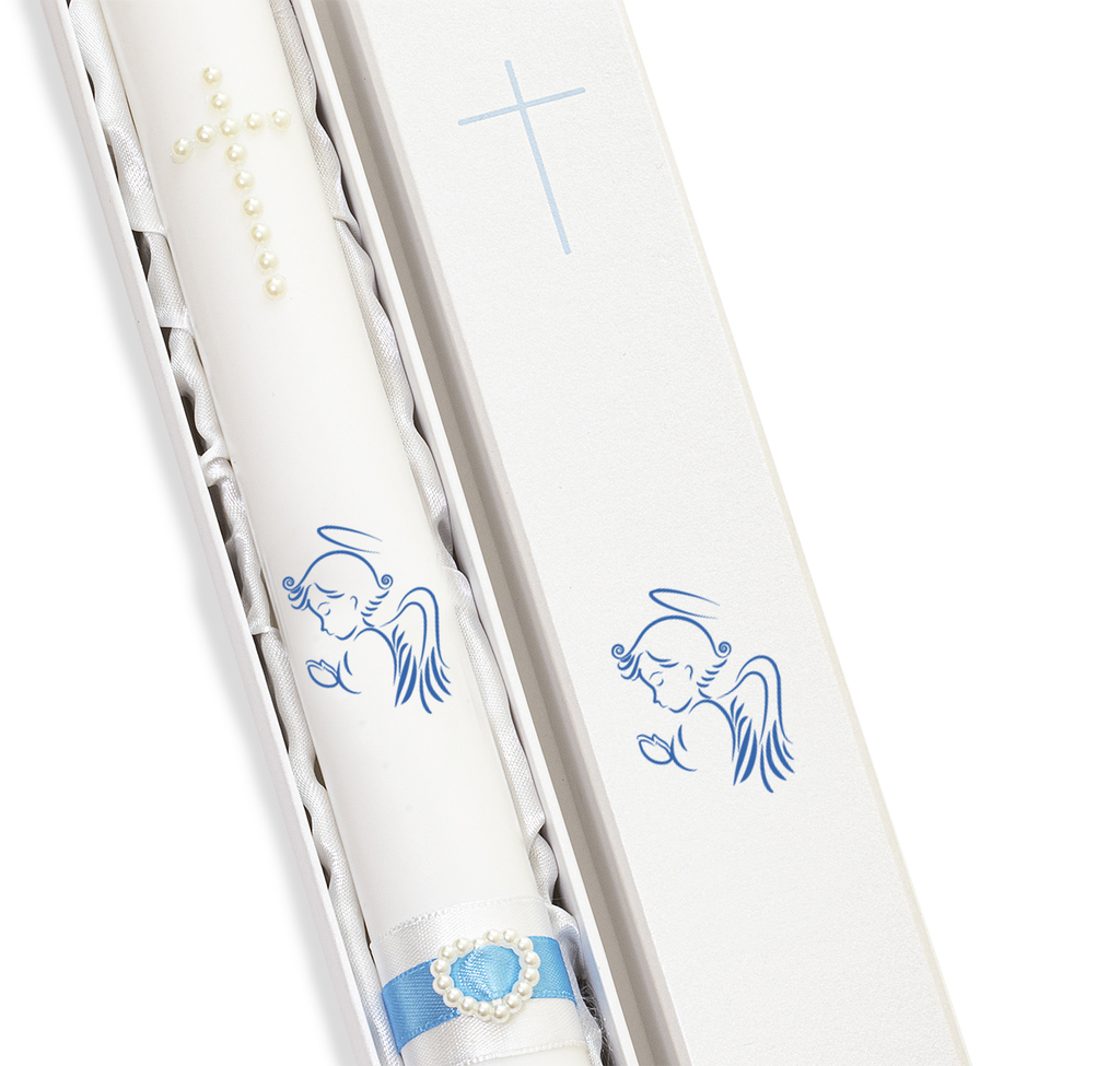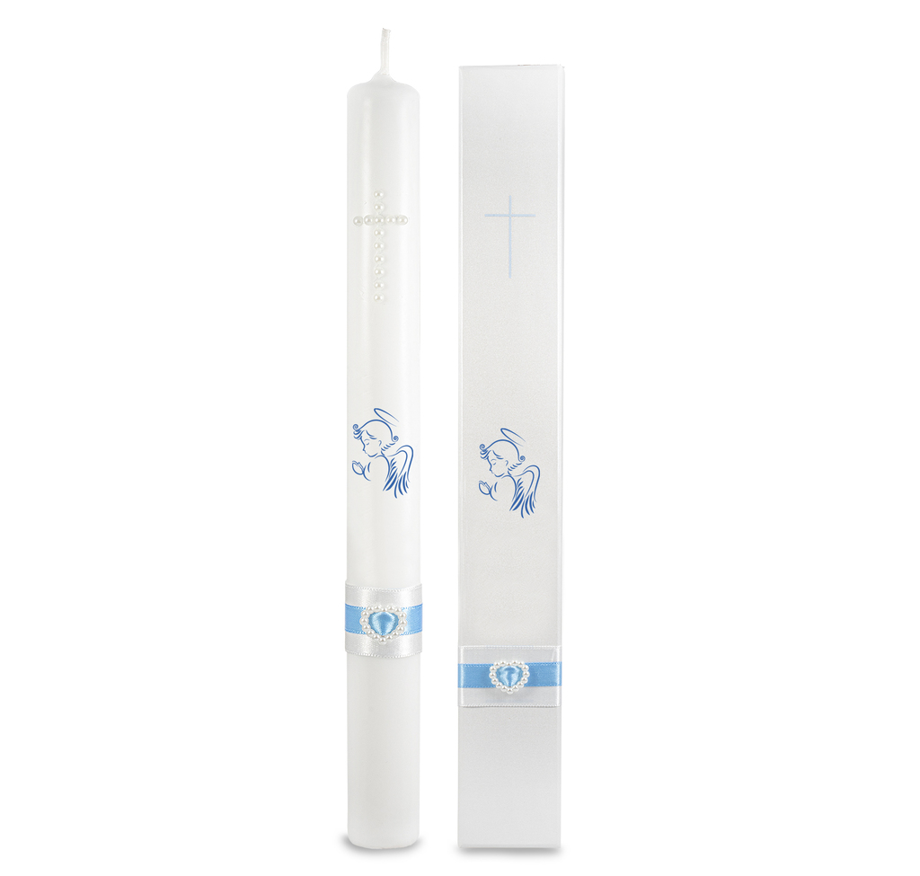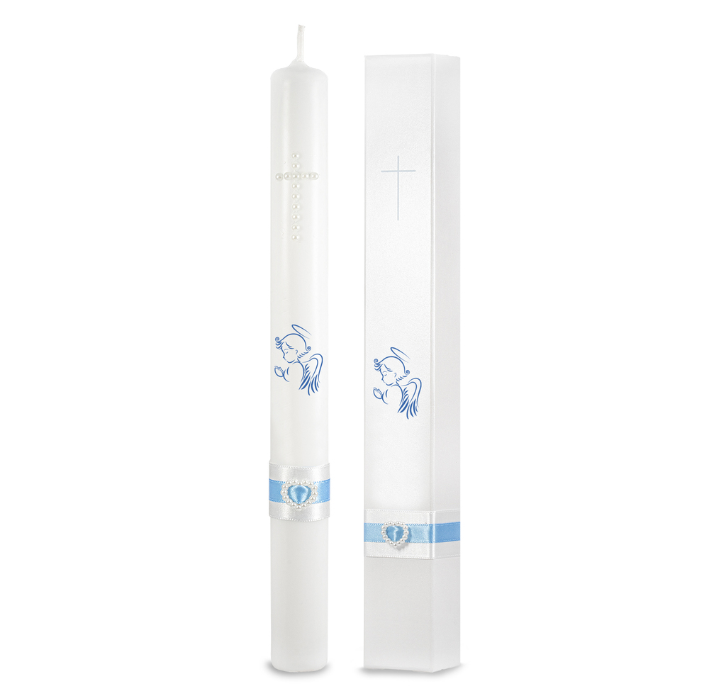 Součástí svíčky je také dárková krabička se stuhou a s modrým andílkem.
