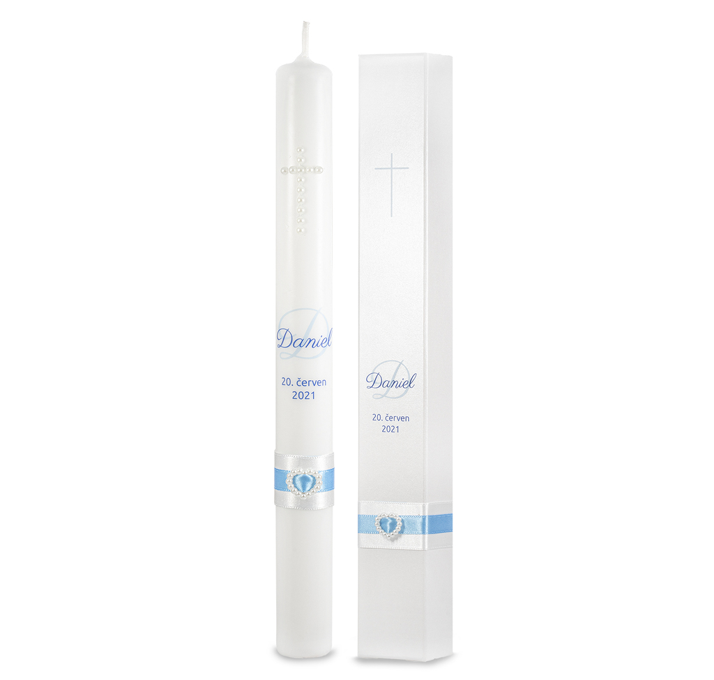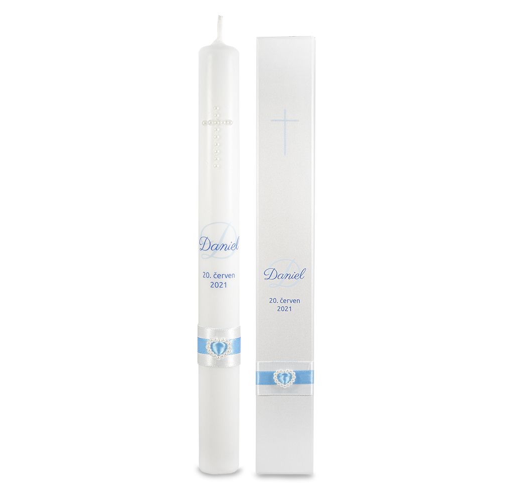 Bílá křestní svíčka pro kluka s jemným bílo-modrým zdobením. Na svíčce je perleťový křížek z drobných perliček a stuha zdobená perličkovým srdíčkem.