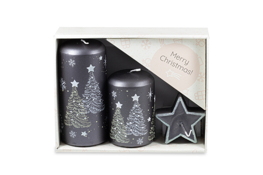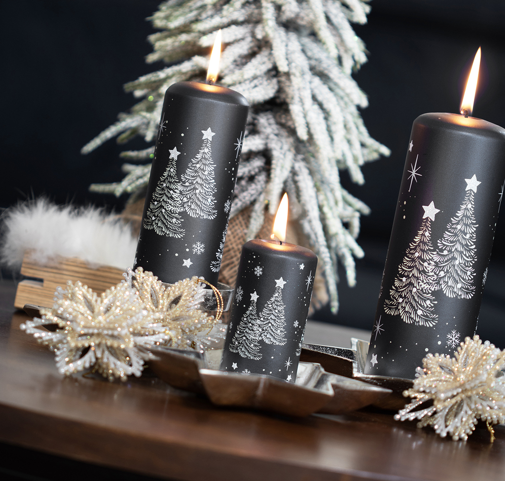 Přineste do svého domova tajemnou atmosféru s naší elegantní vánoční svíčkou ve velikosti 50x100 mm v antracitové barvě. Tato svíčka vytváří sofistikovaný kontrast a dodá vašemu prostoru záhadný nádech. V kombinaci s dekorem bílých a krémových stromečků s třpytivými detaily vytvoříte jedinečnou vánoční atmosféru.