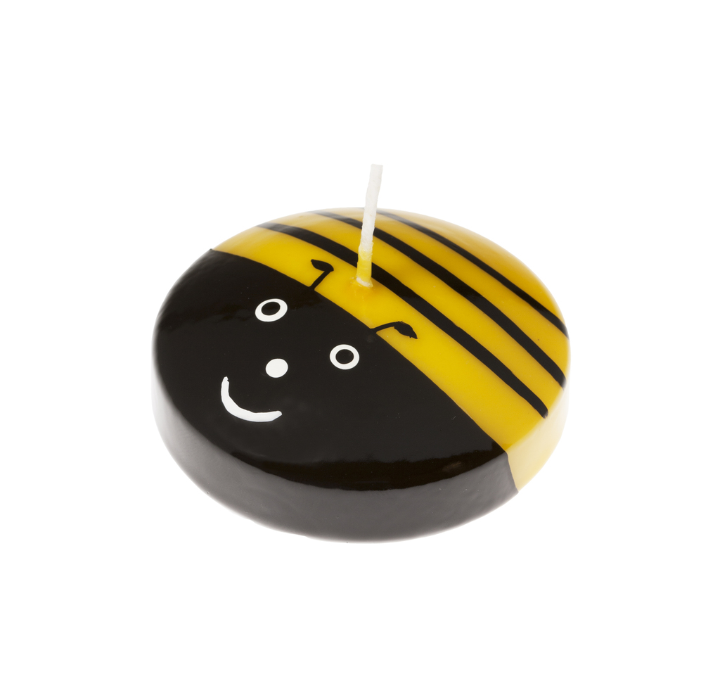 Svíčka ve tvaru plovoucí čočky s ručně malovaným motivem včeličky.