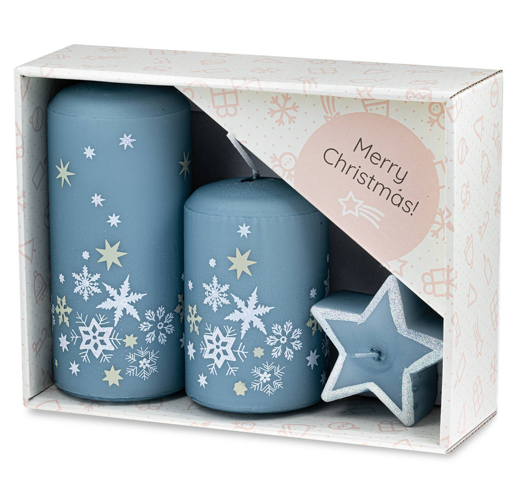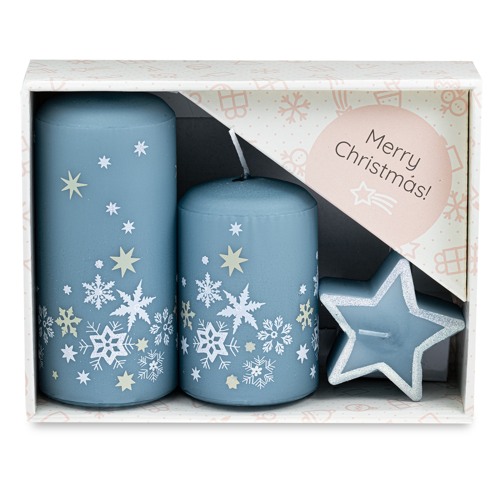 V boxu najdeš dvě svíčky s motivem vloček, jednu plovoucí hvězdičku a zápalky. Elegantní metalický odstín světle modré v kombinaci s jemným třpytem působí jako dotek zimního luxusu. Každá svíčka rozzáří prostor chladivým klidem a čistotou.