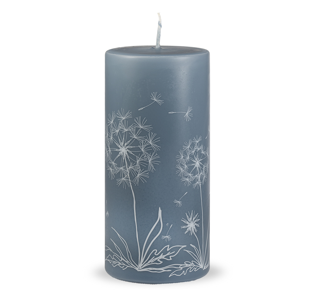 Modrošedá svíčka s jemným vzorem odkvétajících pampelišek v bílé barvě.