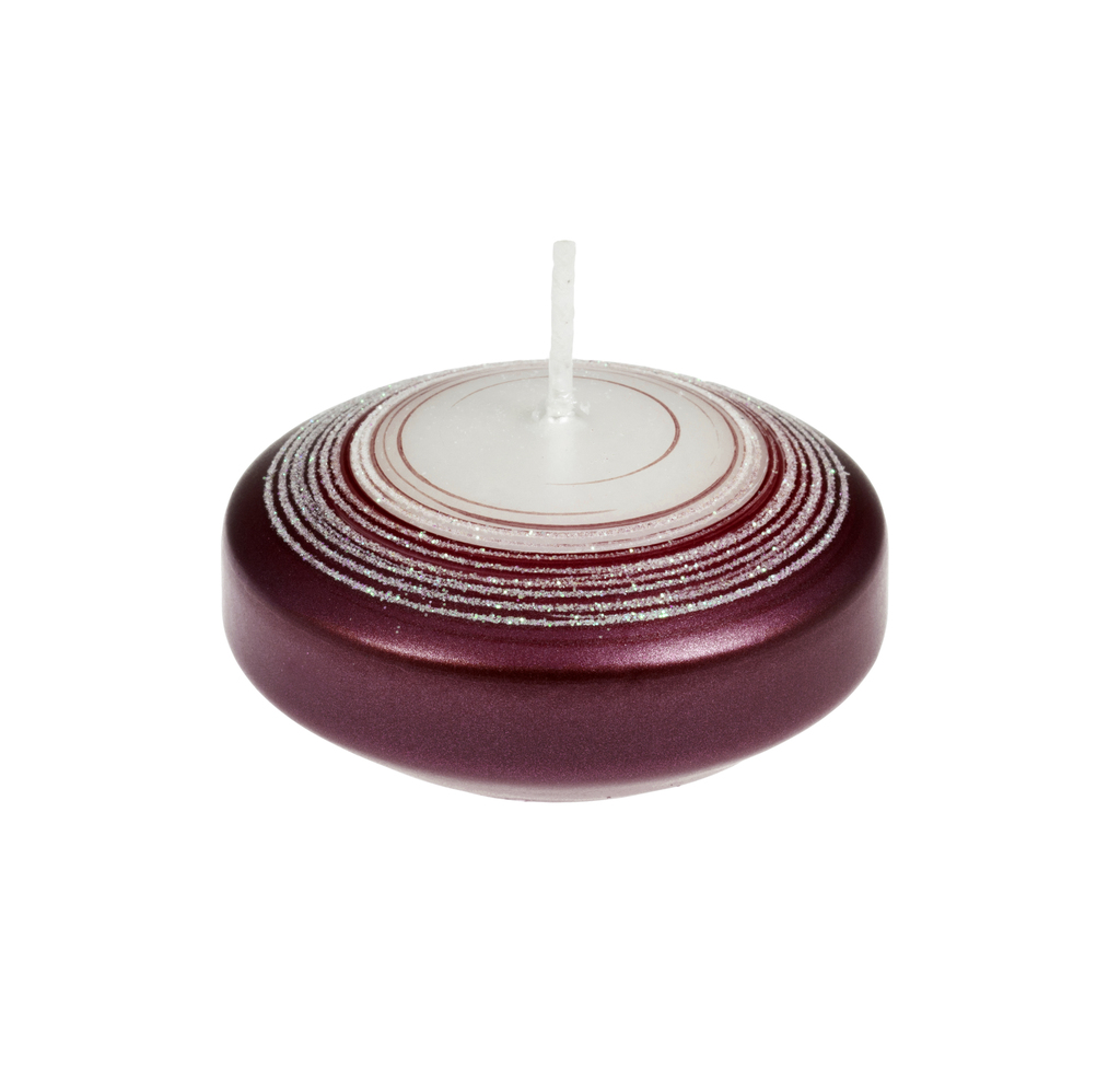 Plovoucí svíčka v metalické barvě bílá perleť - tmavě vínová, dozdobená třpytivými linkami.