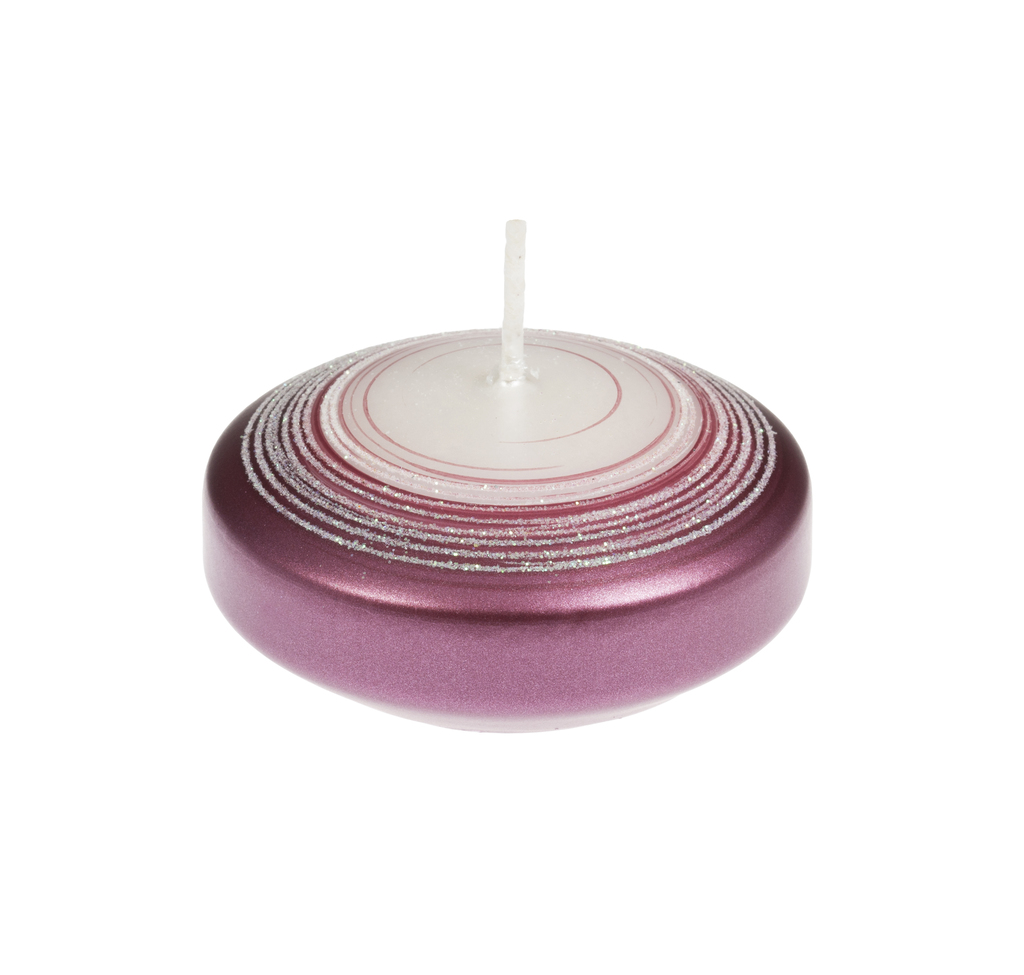 Plovoucí svíčka v metalické barvě bílá perleť - vínová, dozdobená třpytivými linkami.