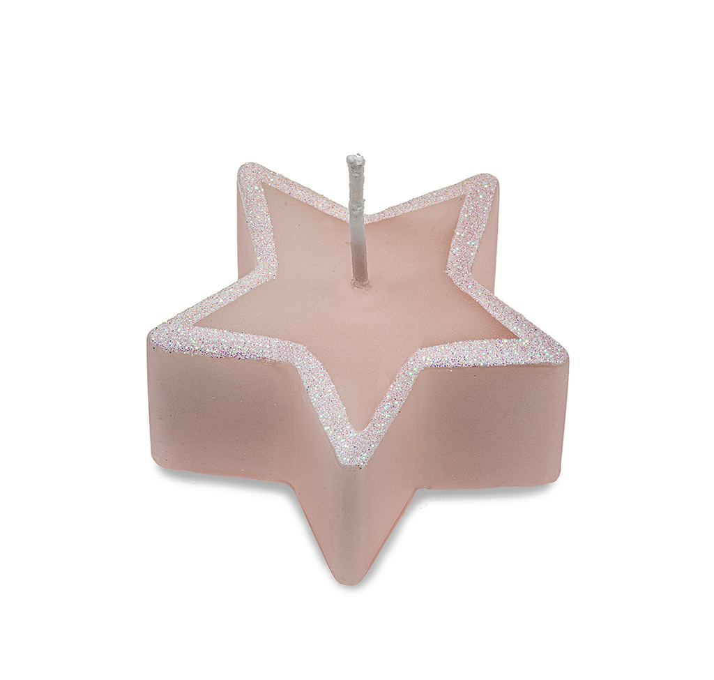 Vánoční svíčka ve tvaru hvězdy v matně pudrové barvě, dozdobená třpytivým posypem, která může plavat na vodní hladině.