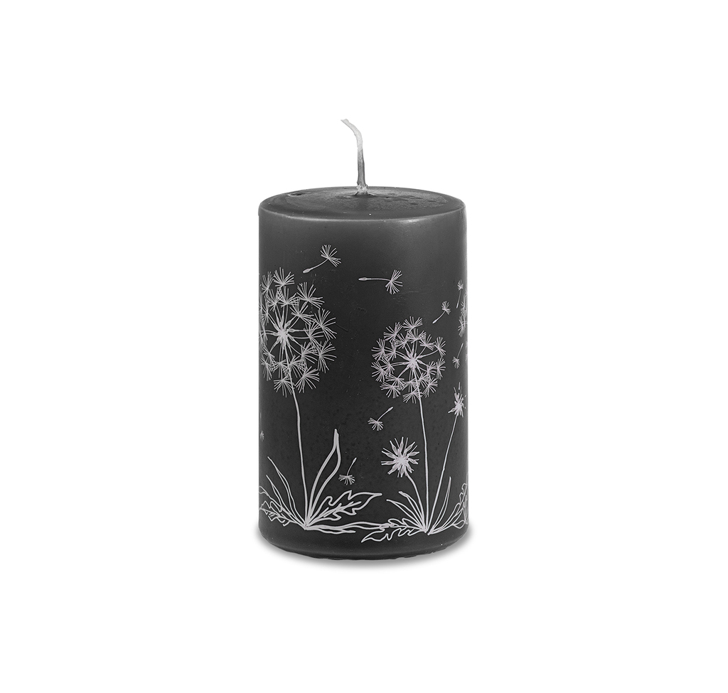Tmavě černá svíčka s jemným vzorem odkvétajících pampelišek v bílé barvě.