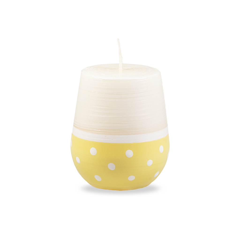 Část svíčky je zdobená žlutou barvou s bílými puntíky a část svíčky má ručně zdobený strukturovaný povrch.