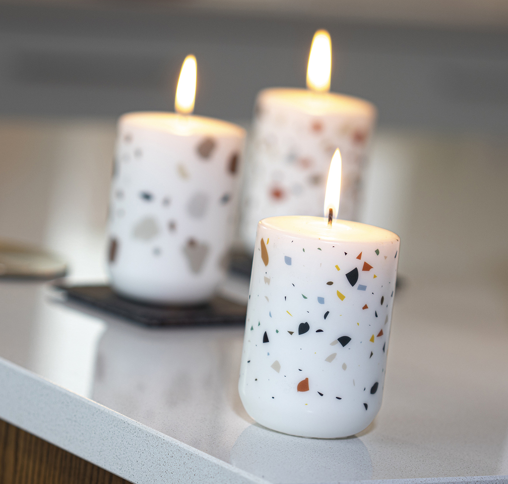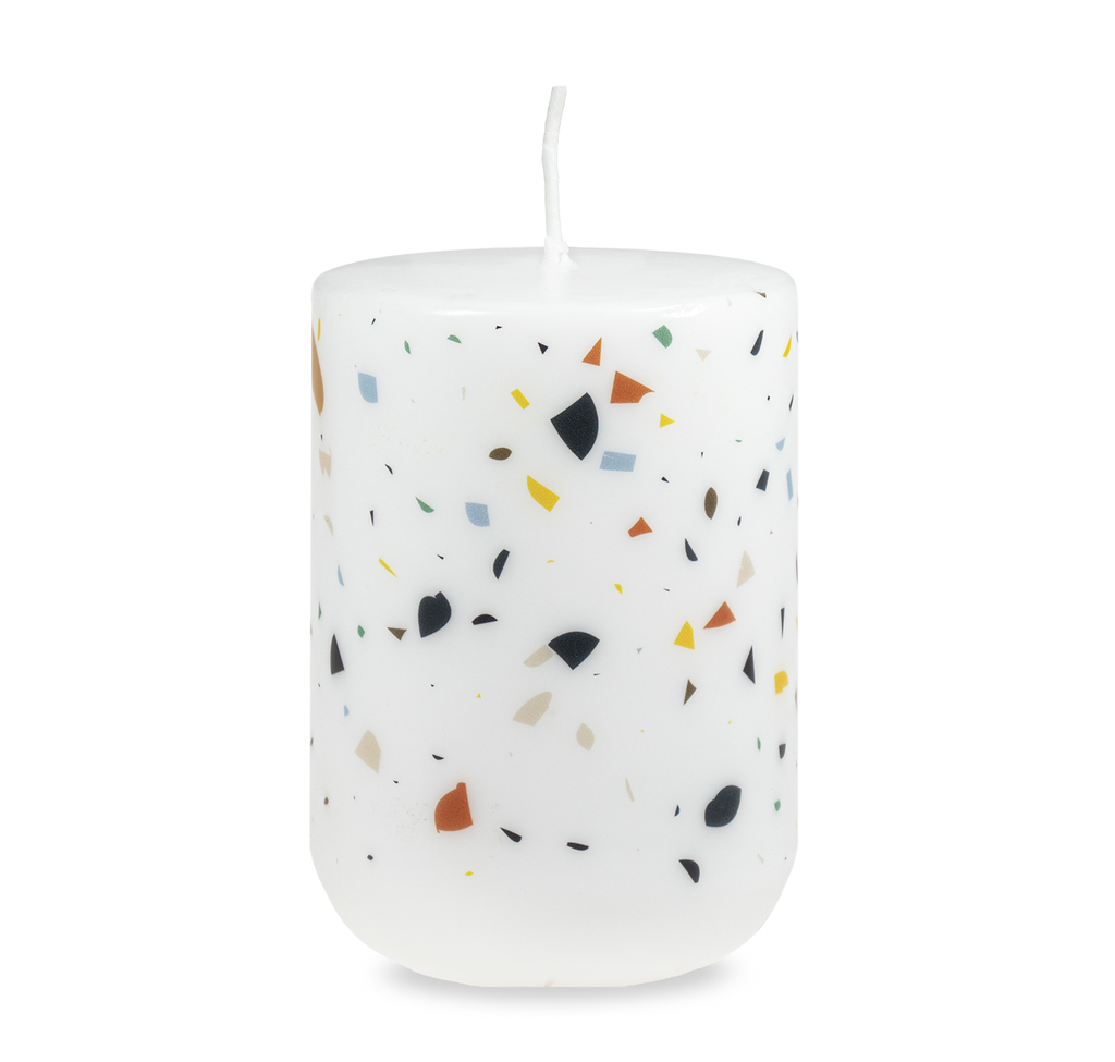 Bílá svíčka s malým vzorem Terrazzo v barvách podzimu.