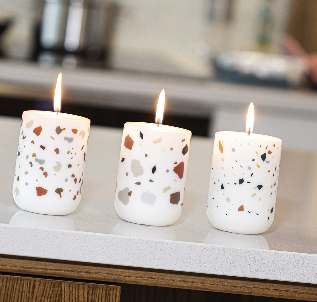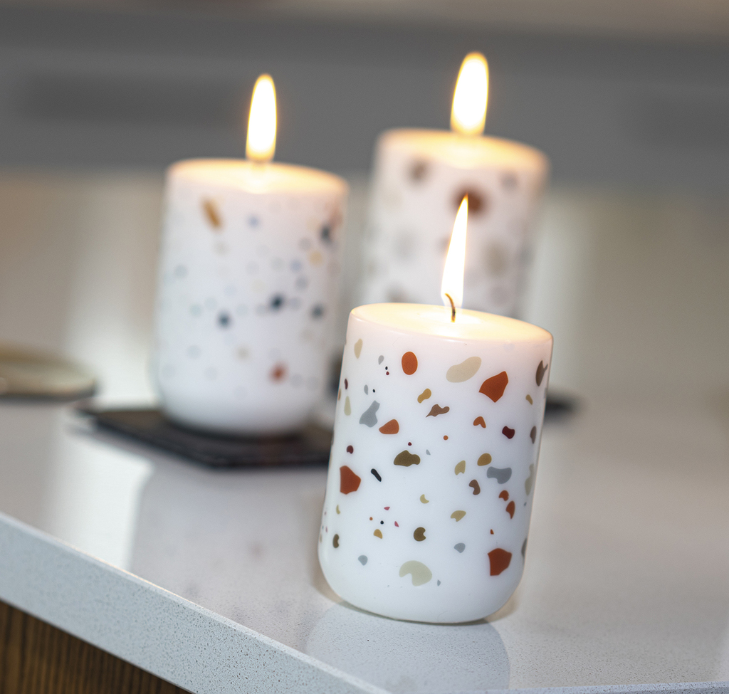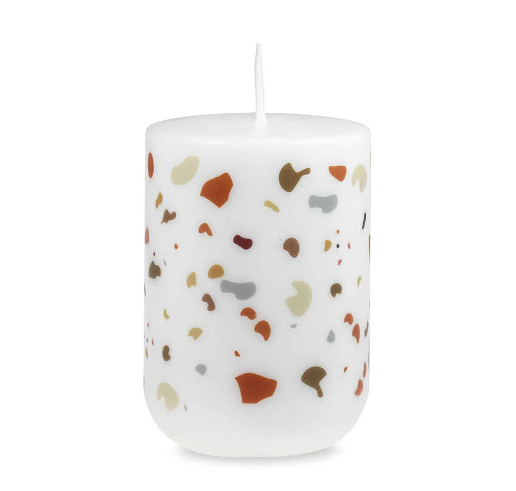 Bílá svíčka s malým vzorem Terrazzo v barvách podzimu.