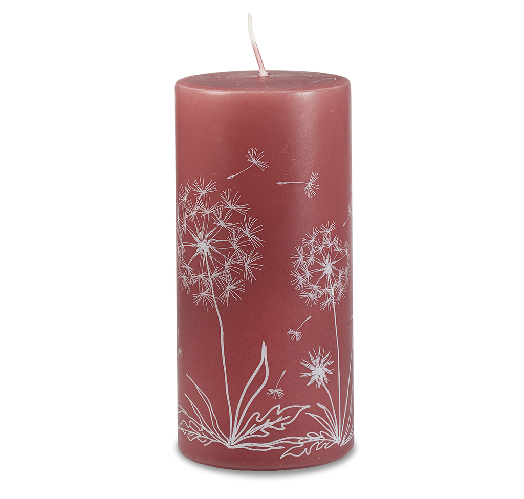 Terakotová svíčka s jemným vzorem odkvétajících pampelišek v bílé barvě.