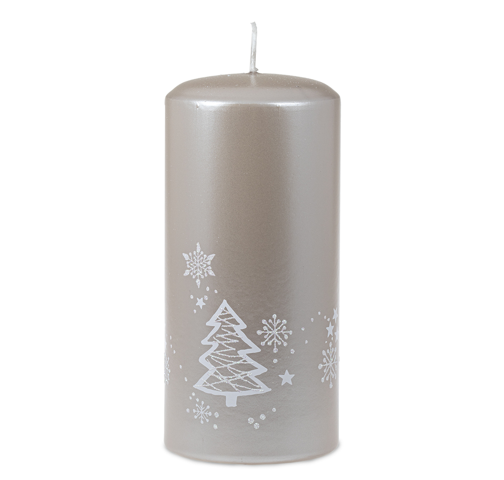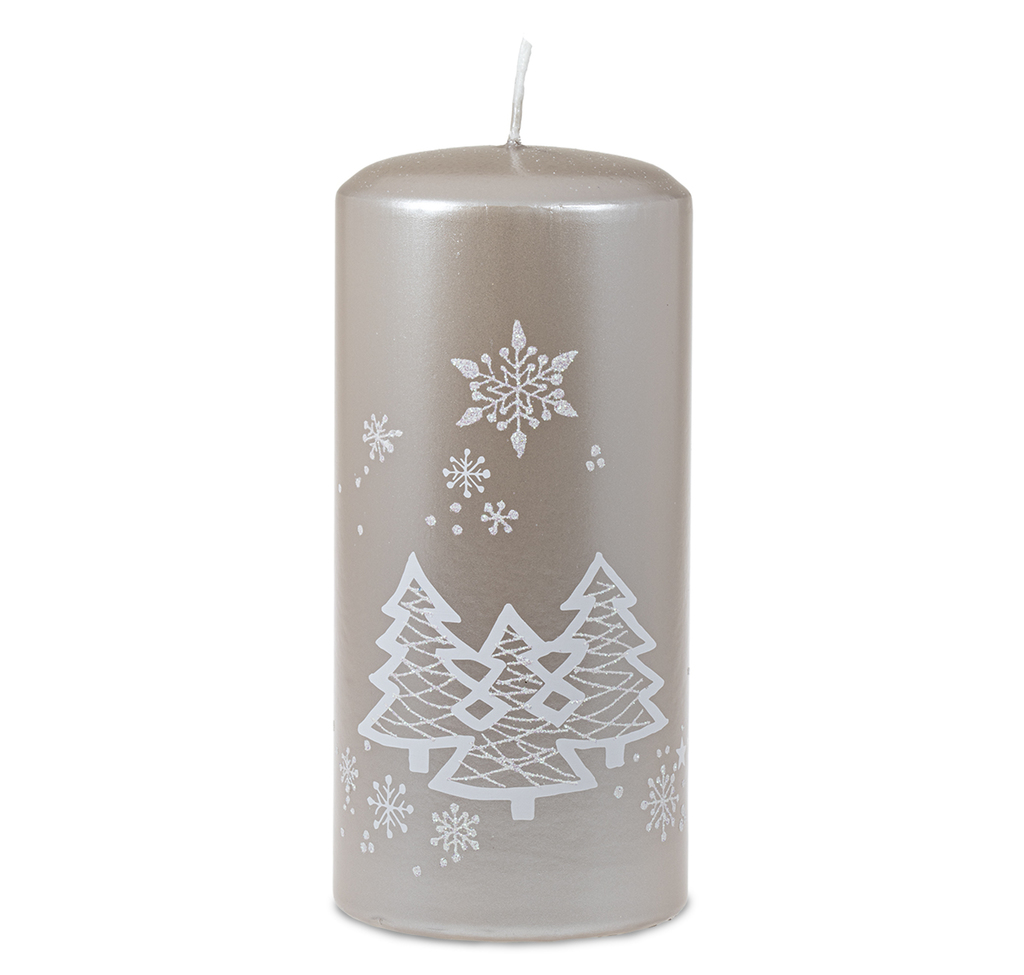 Moka velká vánoční svíčka s krásným bílým motivem stromů plných třpytivého lesku.