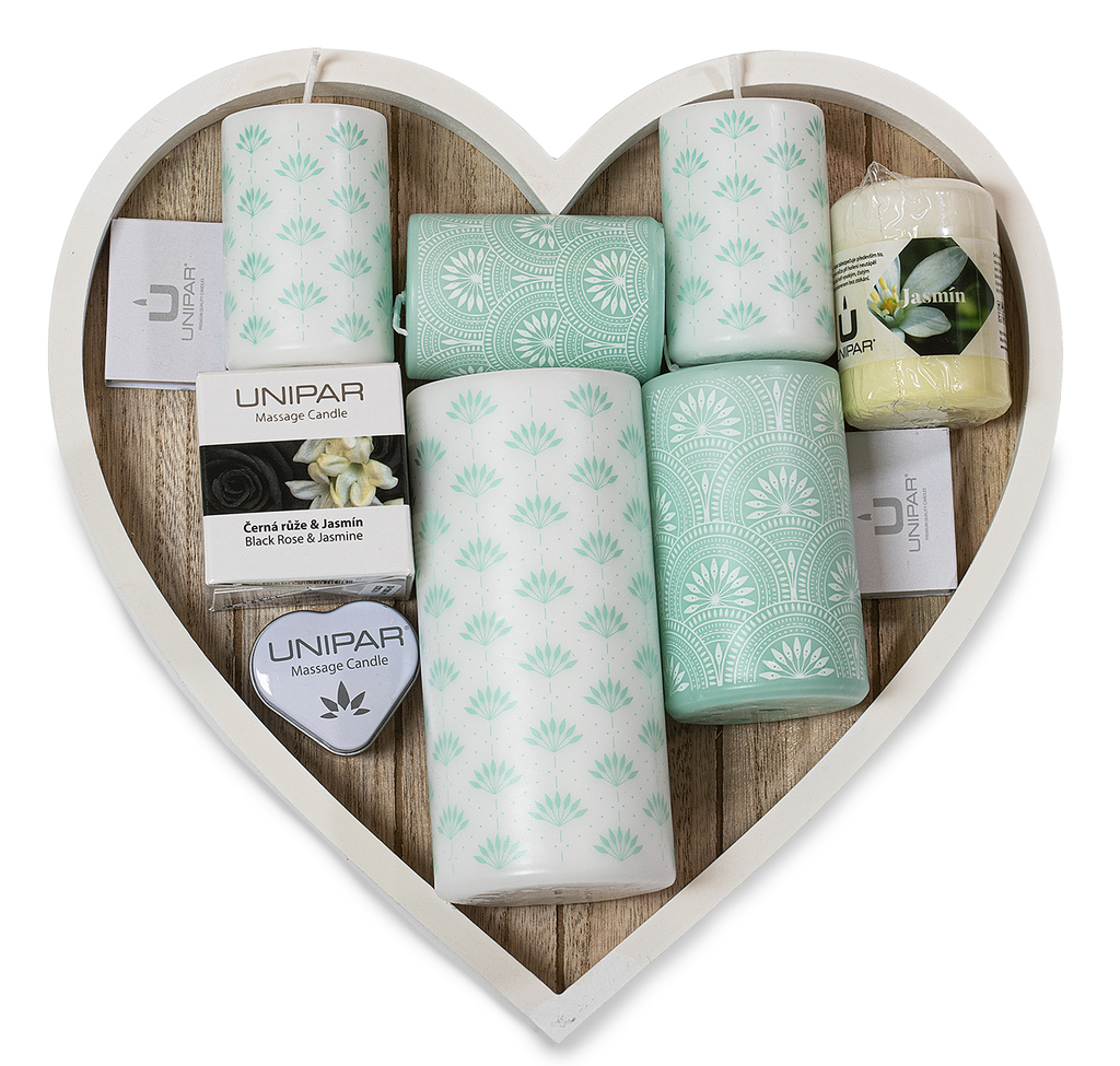 Krásný velký dárkový set svíček z nové kolekce Surprise v tyrkysové barvě na dřevěné podložce ve tvaru srdce.