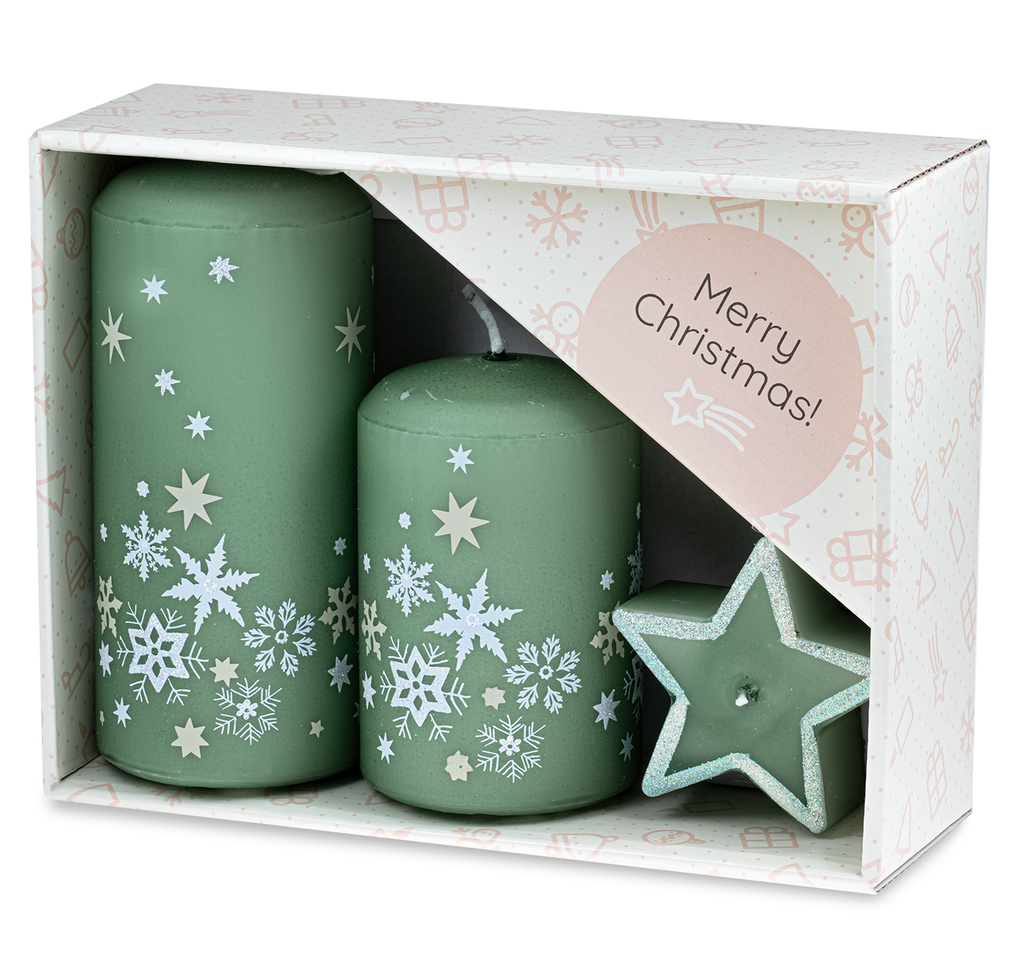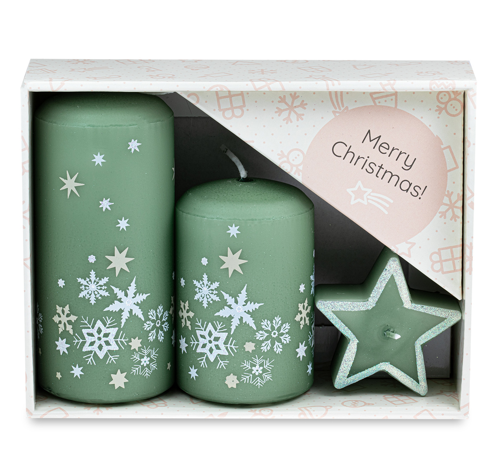V boxu najdeš dvě svíčky s motivem vloček, jednu plovoucí hvězdičku a zápalky. Hluboký zelený odstín s matným metalickým leskem přináší harmonii a luxusní přírodní energii.
