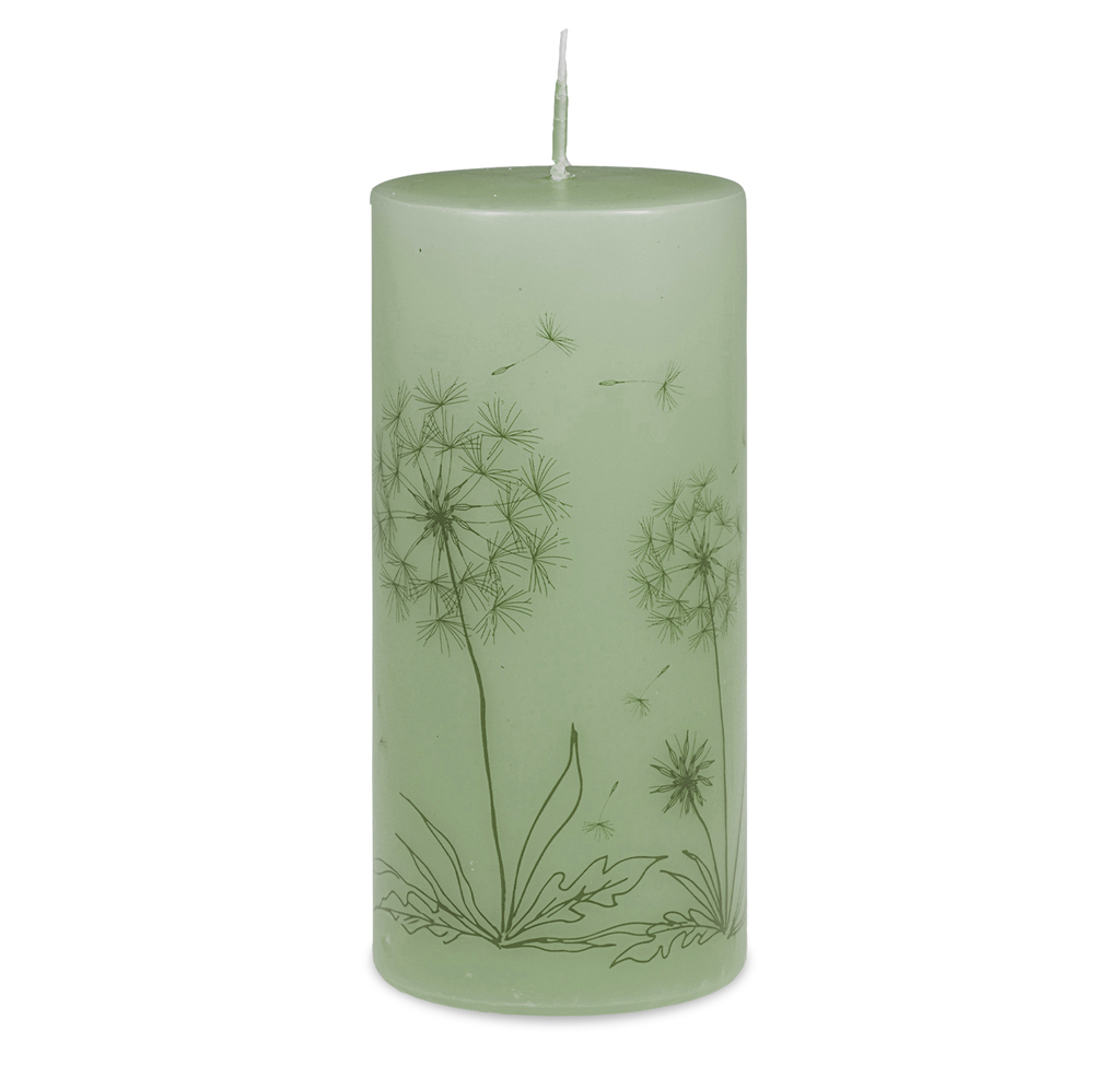 Zelená svíčka s jemným vzorem odkvétajících pampelišek v tmavě zelené barvě
