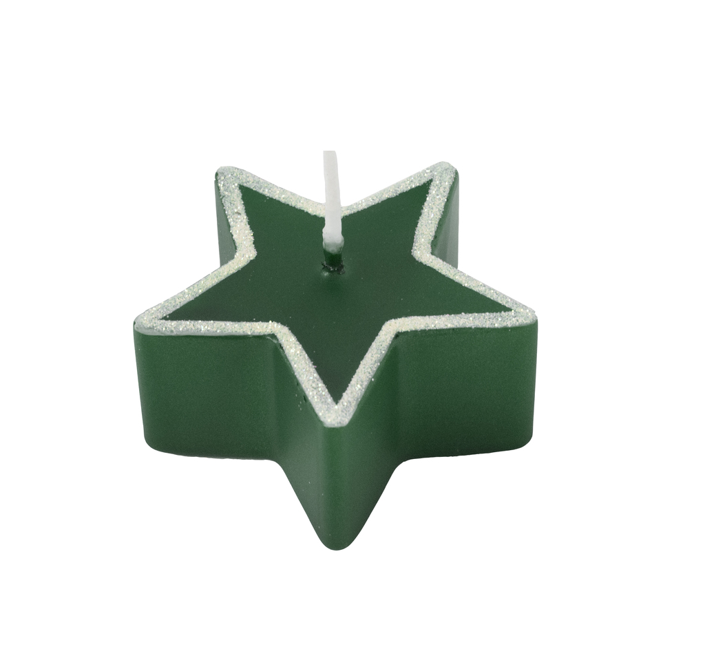Vánoční svíčka ve tvaru hvězdy v zelené metalické barvě, dozdobená třpytivým posypem, která může plavat na vodní hladině.